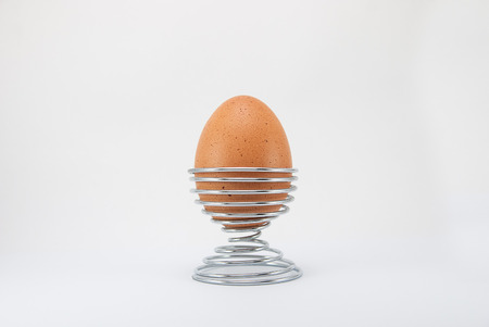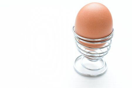 Fresh egg in an eggcup isolated on white background. Traditional food for healthy breakfast.