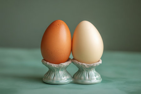 Two distinct eggs rest in delicate holders against a muted green surface, showcasing their contrasting colors and textures. The warm brown egg stands beside the smooth white egg, emphasizing the beauty of natural shapes and forms.