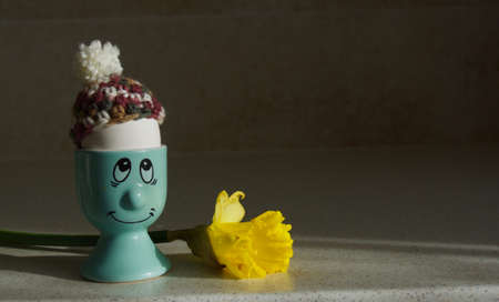 Fresh free range eggs with natural feathers in egg cups, eggs in woolen caps, funny food