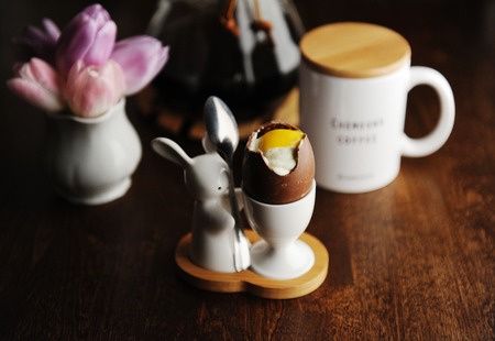 Easter dessert chocolate eggs filled with cream and ice cream imitating white and yolk. Served on porcelain holder with Easter bunny. Flowers on background