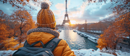 A young caucasian male photographer stands silhouetted against a vividly colorful sky, capturing the eiffel tower at sunset. his backpack suggests travel and adventure, while the scene exudes a modern and artistic flair.