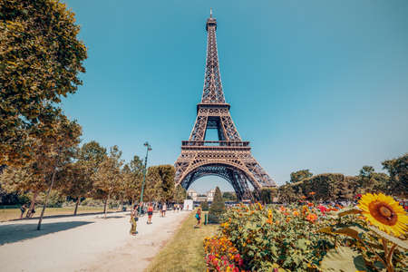 Paris, France, July 07, 2018: Tourists by world famous Eiffel tower