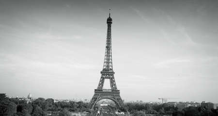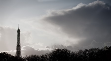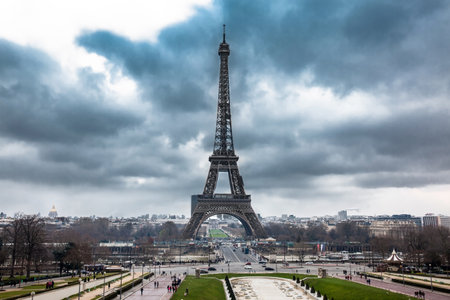 Eiffel Tower in darkness without the light display viewed across the park with dramatic white clouds and copy space for tourism and travel themes