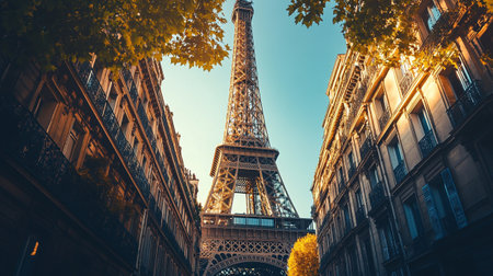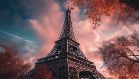 The iconic Eiffel Tower with lush autumn foliage in the foreground. AI-generated.