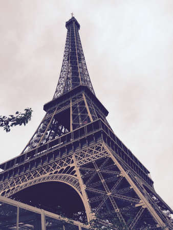 Paris France circa September 2012: A night photograph of the Tour Eiffel taking underneath the structure looking up photos has an applied Vintage filter