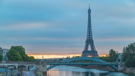 Eiffel Tower sunrise timelapse with boats on Seine river and in Paris, France.