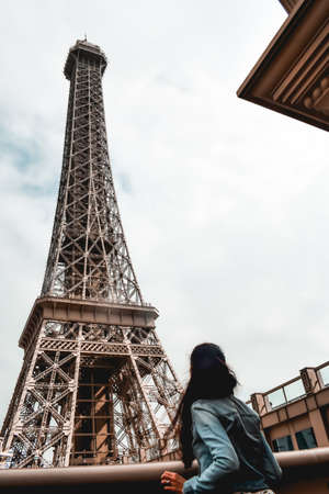 Tourist girl looking up to the copy of the Eiffel Tower at the Parisian Casino in Macau