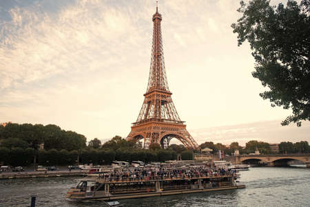 Paris, France - September 29, 2017: boat trip on Seine river. Eiffel tower. Iconic landmark. Water tour. Sightseeing cruise. Tourism and travel. Tourist destination. Discover famous monuments