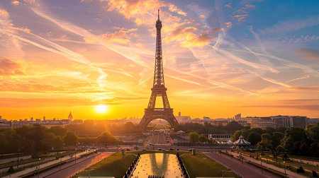 A stunning sunset view of a Eiffel Tower ,nearby buildings in Paris