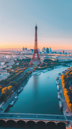 The Eiffel Tower is seen in the distance, with the city of Paris in the background. The sky is a beautiful blue color, and the water is calm and clear. Concept of peace and serenity