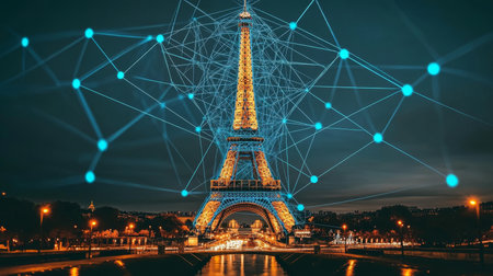 Eiffel Tower Paris, France in Digital Network Style with Glowing Dots Night Cityscape