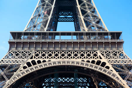 Detail of truss of Eiffel Tower bottom view and blue sky