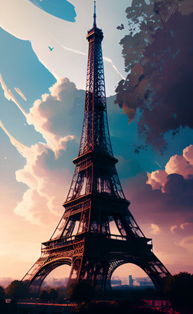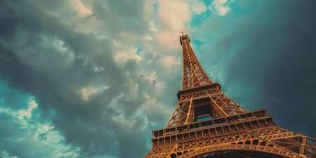 The world-famous Eiffel Tower against a dramatic cloudscape. AI-generated.