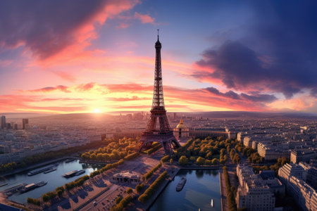 Beautiful panoramic view of the Eiffel Tower at sunset in Paris, France, Aerial panoramic view of Paris with Eiffel Tower at sunset, France, AI Generated