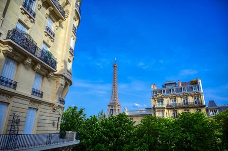 A view of the Eiffel Tower from the streets of Paris, France.