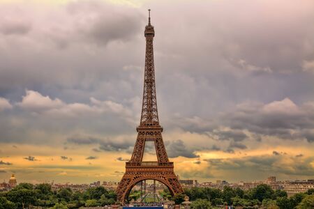 Famous Eiffel Tower under beautiful cloudy sky at sunset in Paris, France.