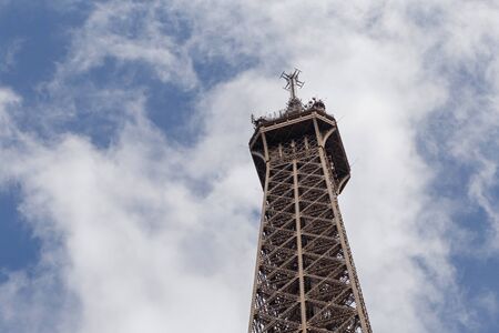 top part of Eiffel tower against cloudy sky