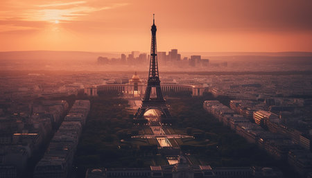 Generative AI Image of Majestic Eiffel Tower Shining Brightly at Sunset Sunrise Sky
