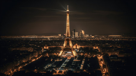 Generative AI Image of Majestic Eiffel Tower Shining Brightly in Modern Downtown at Dark Night Sky