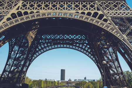 Detail of truss of Eiffel Tower bottom view and blue sky