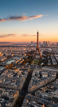 Our image captures the allure of the Eiffel Tower and Parisian parks, bathed in romantic light, with cozy hotels and apartments nearby
