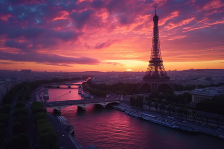 A picturesque view of the Eiffel Tower at sunset, with the Seine River in the foreground. The sky is a vibrant mix of pink, orange, and blue hues, casting a warm glow over the city. Several boats are docked along the riverbank, adding a touch of life to the scene.