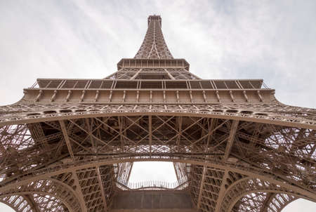 Looking up at the eiffel tower on a cloudy afternoon