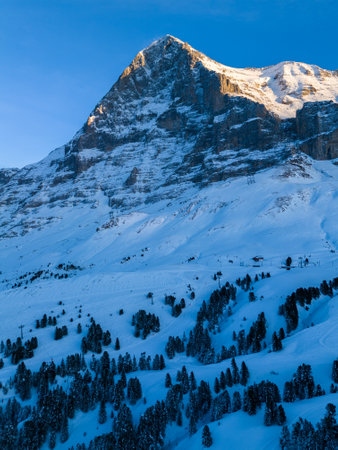 Eiger North Face Mountain at Sunset in Winter. Swiss Alps. Switzerland. Aerial View