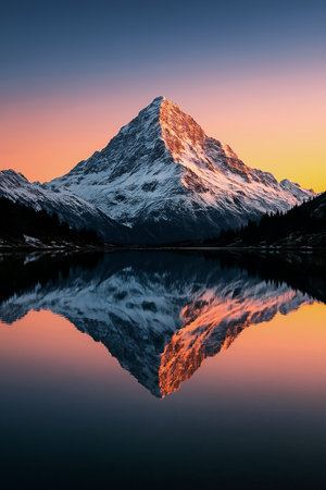 Matterhorn peak reflected in the lake at sunrise, Switzerland.