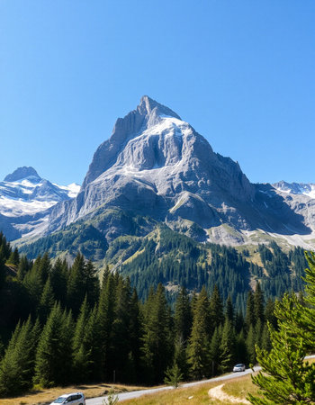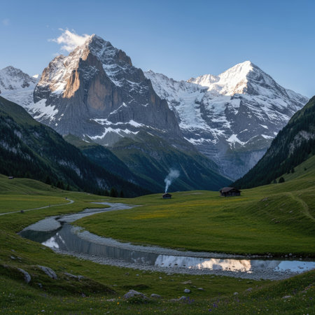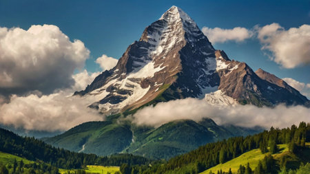 Stunning panoramic view of snow capped alps with rocky peaks and lush vegetation under blue sky
