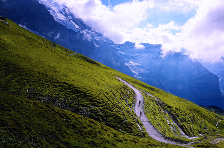 Outdoors in the Mountains; Travelers on a Trail in Swiss Alps