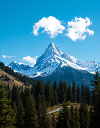 Mountain landscape with snow-capped peaks and coniferous forest.