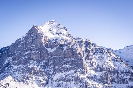 Mountain landscape with snow and clear blue sky at sunset, Switzerland