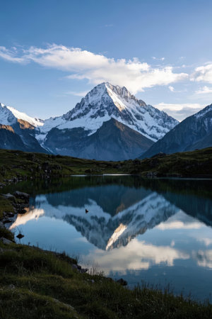 High mountains and reflection on the surface of the lake. Mountain valley with lake. Landscape in the highlands in the summertime. Photo in high resolution.