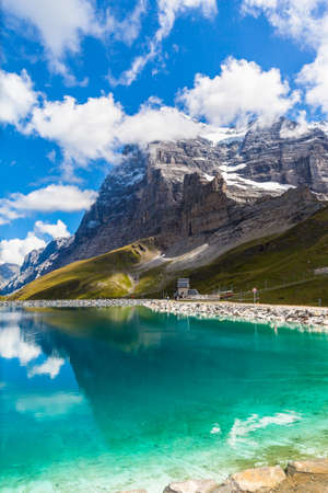 Stunning view of Eiger Northface and the glacier at the lake side of Fallbodensee on Bernese Oberland, Switzerland.