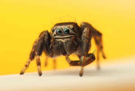 Small hairy creepy jumping spider close up.