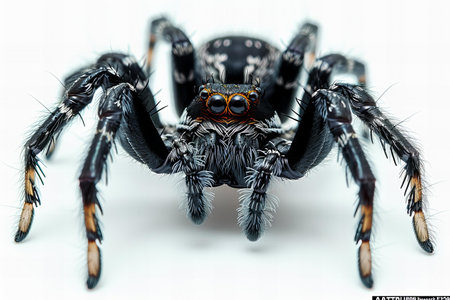 Close up of black spider isolated on white background. Macro shot.