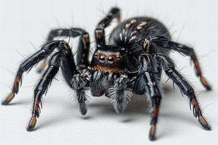 Close up of a black spider on white background, macro photography.