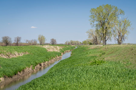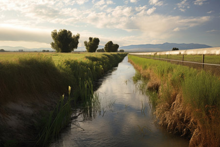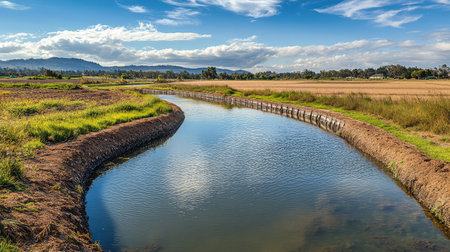 Irrigation canal winding through farmland, well-maintained water distribution system and open view with copy space