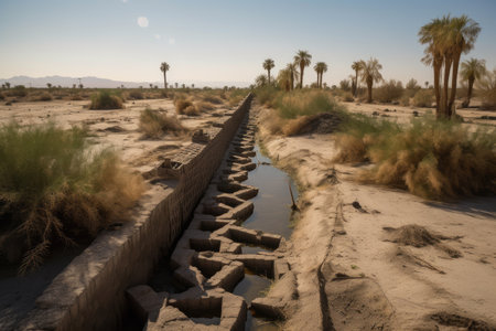 ingenious irrigation system that once provided water to desert oasis, now dried and broken, created with generative ai