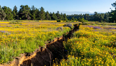 A deep fissure cuts a dramatic path through a vibrant meadow of yellow wildflowers, creating a stark contrast between natural beauty and geological forces.