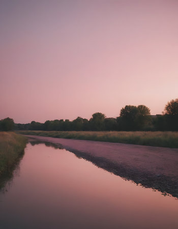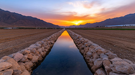 A serene landscape featuring a water canal reflecting the vibrant colors of a sunset, flanked by fields and mountains.