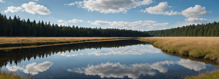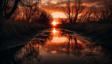 Tranquil scene of a sunset over a swamp with reflections generated by artificial intelligence