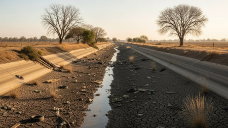 flooded irrigation canal overflowing into adjacent field, created with generative ai