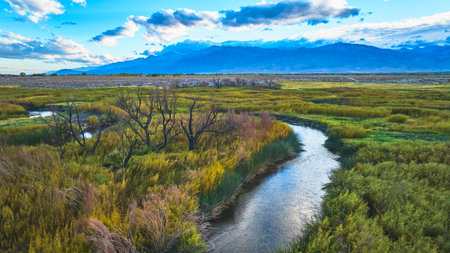 Aerial Owens River Meandering Through Wetlands and Sierra Mountains in California