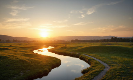 A peaceful river winding through a meadow at sunset, with the soft, warm light of the setting sun casting golden