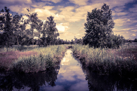Small river in a field with green swamp water on sunset background in summer season. Wetlands declining and under threat. The problem of ecology and drainage of rivers and swamps