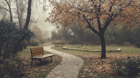 A tranquil autumn scene featuring a winding pathway lined with vibrant leaves and a rustic bench, enveloped in a soft fog, inviting peaceful walks.
