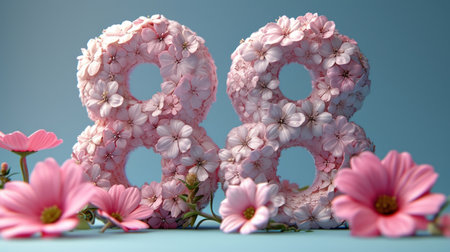 Number 8 made of flowers, colorful and rich blue background. Postcard and layout for International Women's Day. With Generative AI technology.