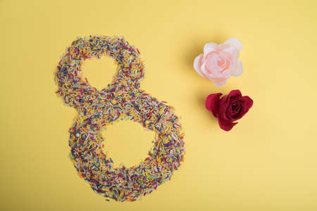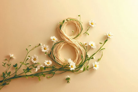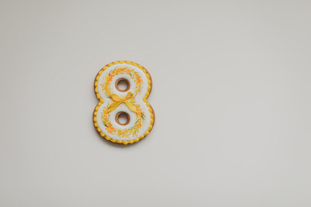 Womens Day, March 8, figure eight, gingerbread, flowers. Space for text.